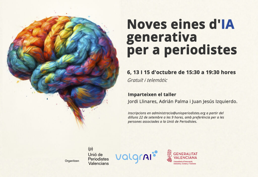 La Unió de Periodistes Valencians organitza els dies 6, 13 i 15 d’octubre el curs ‘Noves eines d’IA generativa per a periodistes’, amb la col·laboració de ValgrAI i la Conselleria d’Innovació. Aquesta formació, que impartiran Jordi Linares, Juan Jesús Izquierdo i Adrián Palma, serà online en horari de 15:30 a 19:30 hores.