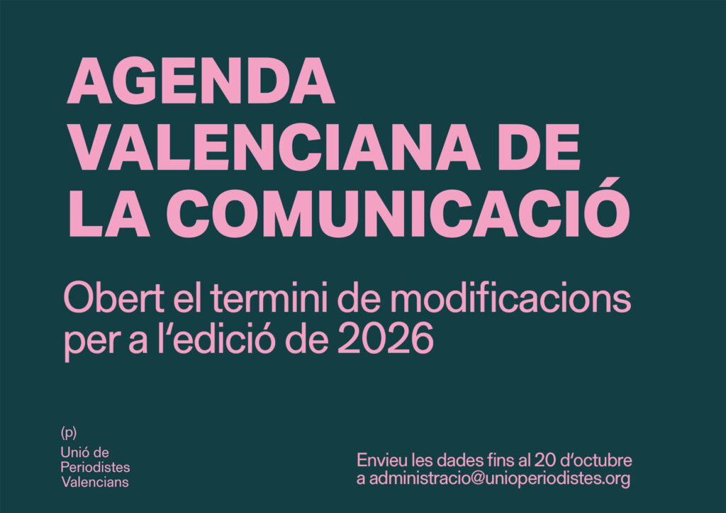 Un any més comencem el procés d’actualització de l’Agenda de la Comunicació amb l’objectiu de dotar els i les periodistes valencians/es, i a qualsevol altra persona interessada, d’una eina eficaç a l’hora de contactar amb totes aquelles institucions, organitzacions i professionals relacionats/des amb l’àmbit de la comunicació.