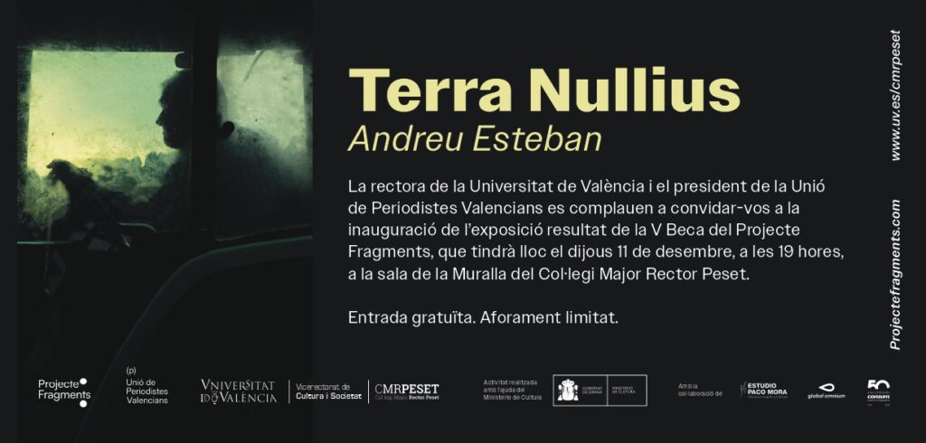 El pròxim 11 de desembre, a les 19 hores, s’inaugura a la Sala de la Muralla del Col·legi Major Rector Peset l’exposició Terra Nullius, resultat del projecte guanyador de la V Beca Fragments, impulsada per la Unió de Periodistes Valencians. La mostra està coorganitzada amb el Col·legi Major Rector Peset de la Universitat de València i podrà visitar-se fins al 8 de febrer de 2026.