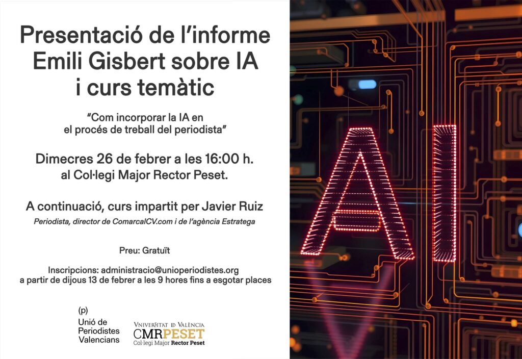 En acabar la presentació, començarà el taller pràctic: ‘Com incorporar la IA en el procés de treball d’un periodista’, que impartirà Javier Ruiz periodista, director del mitjà digital Comarcalcv.com i de l’agència de comunicació Estratega.