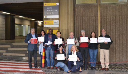 *PIE DE FOTO: Periodistas y trabajadores del Centro Internacional de Prensa se suman a la acción solidaria con sus colegas encarcelados en Turquía. Entre ellos (2ª, 4ª y 5ª, de izquierda a derecha, en la fila delantera), el secretario general y la presidenta de la FAPE, Jesús Picatoste y Elsa González, y el miembro del Comité Ejecutivo de la FIP, Paco Audije.